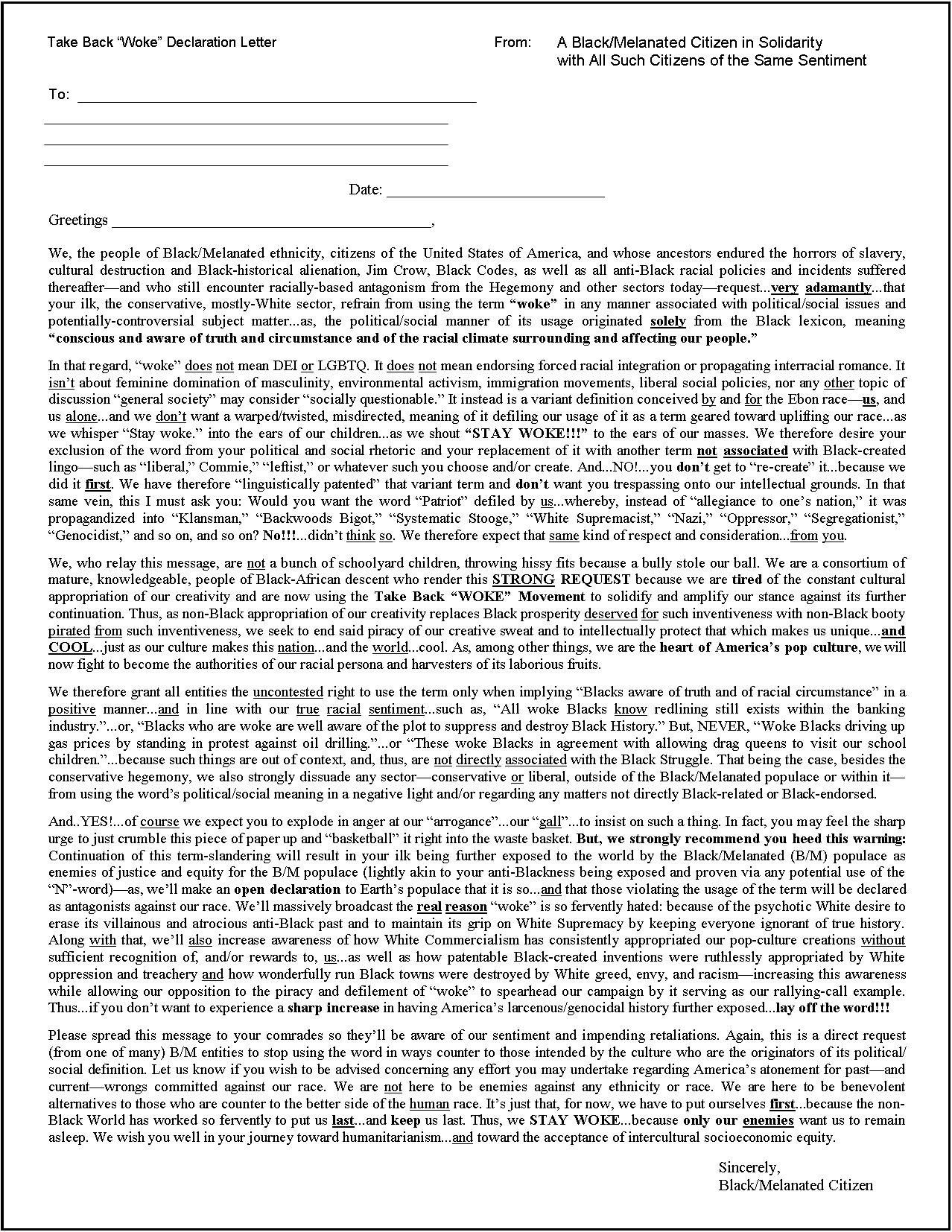 If desired, use the letter below (Personal or Anonymous) as your "declaration" of support regarding proper use of the work "woke" in regard to its Black-originated political/social origin. Copy the image, resize its rectangular boundaries to the size of a standard sheet of paper in your word-processing program, then print it out (shrink it if necessary regarding your printer's boundary limits). Afterward, if using the Anonymous version, use the blank lines to write in your, and the recipient's, names and addresses. Then sign the line at bottom. Lastly, of course, mail it to the appropriate recipient. Especially concentrate on spreading this message to conservatives hostile to Black progress. (*This letter may be updated/edited at later dates if necessary.) |