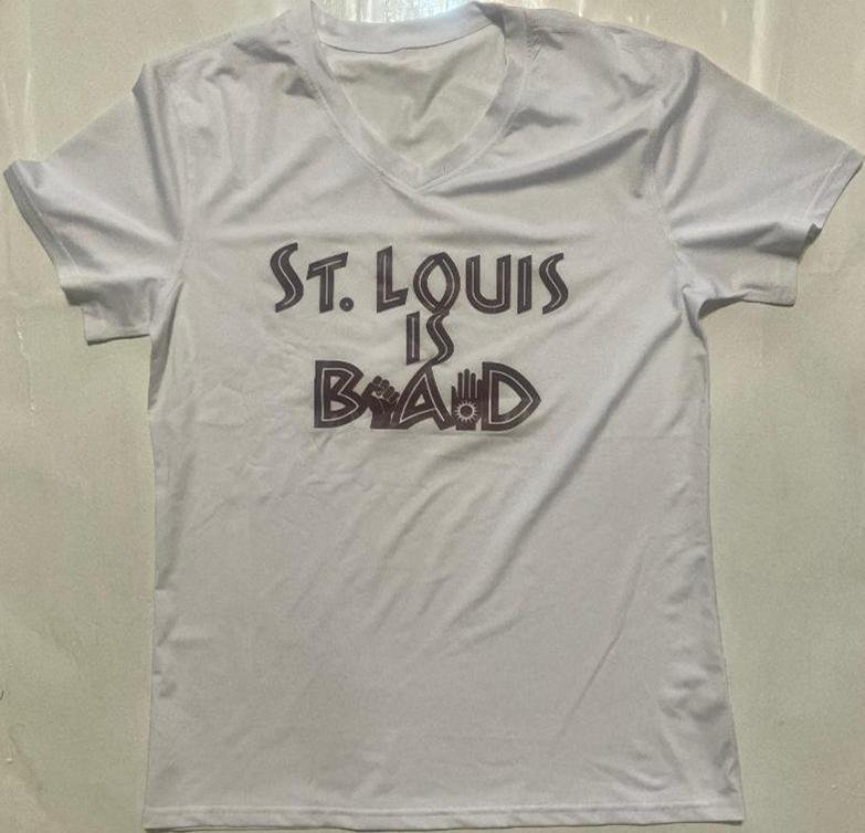 Item # TBMTee-162: L V-Neck Tee. White. 95% Polyester, 5% Spandex.