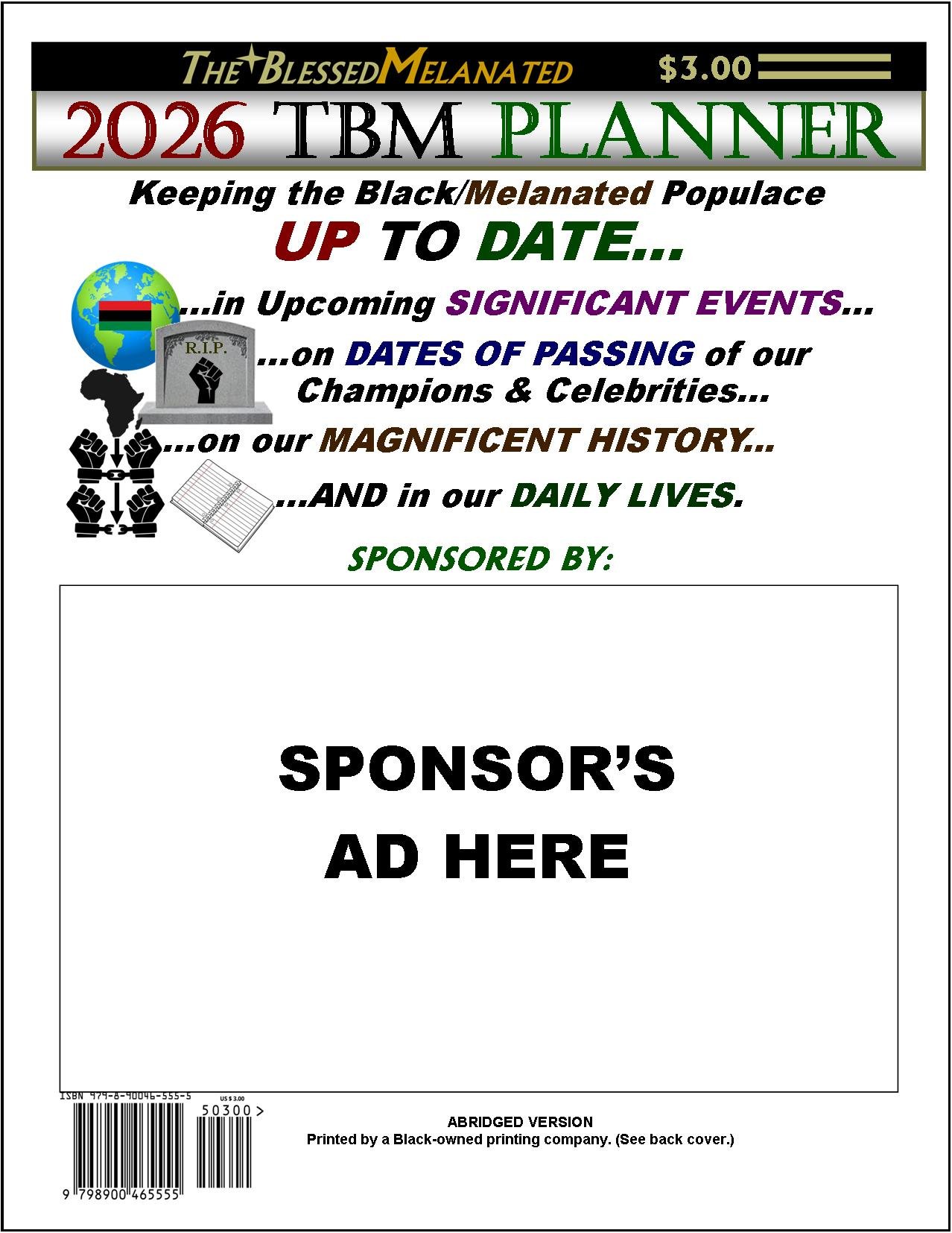 The Abridged Version features the same content as the Full Version, however the following ad pages that are in the Full are omitted from the Abridged: 10, 11, 18-21, 28, 29, (One-Line Ads 36, 37), 42 & 43. The Abridged is particularly beneficial for Black entities wishing to fund the printing of copies at cheaper prices than the Full and fund the printing of copies mainly via sales to buyers--with only a few spaces for sponsors, or the entities can use those for their own purposes. |