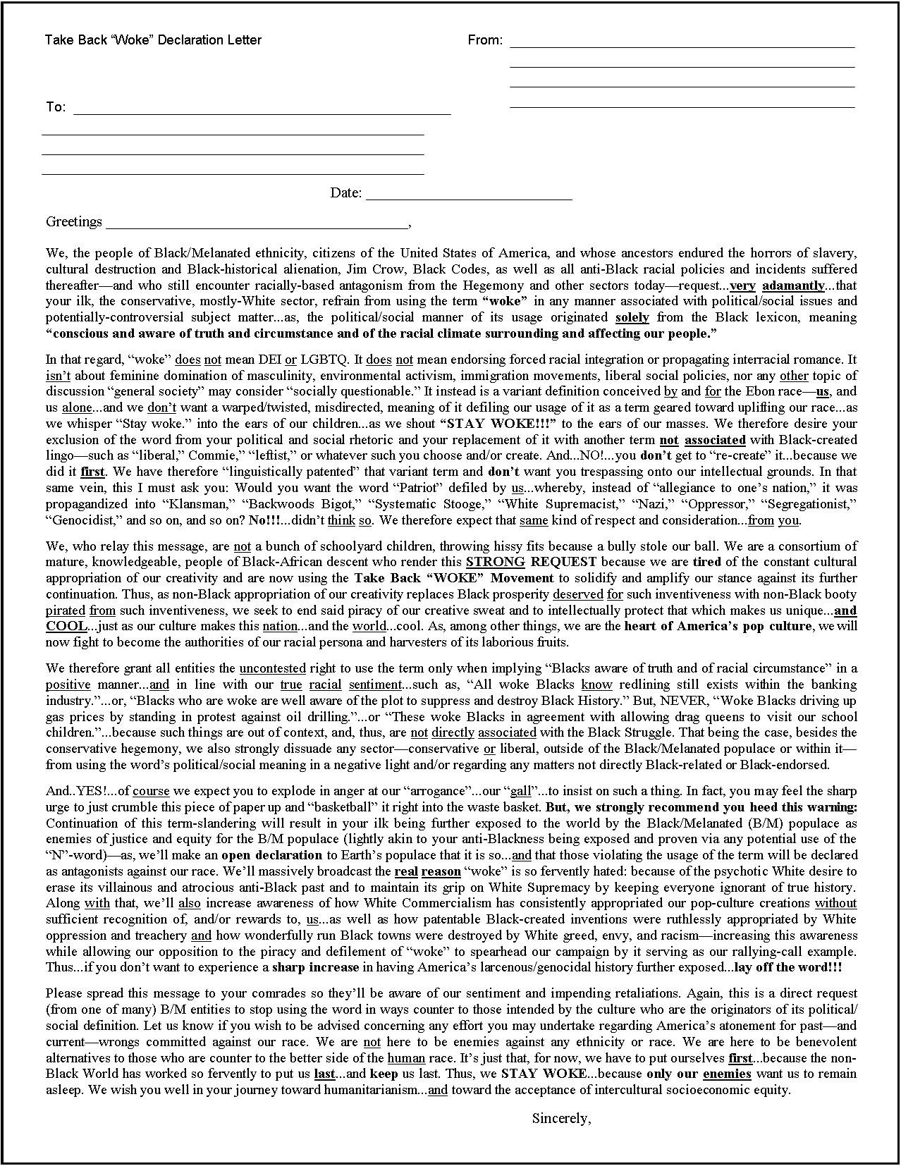 If desired, use the letter below (Personal or Anonymous) as your "declaration" of support regarding proper use of the work "woke" in regard to its Black-originated political/social origin. Copy the image, resize its rectangular boundaries to the size of a standard sheet of paper in your word-processing program, then print it out (shrink it if necessary regarding your printer's boundary limits). Afterward, if using the Anonymous version, use the blank lines to write in your, and the recipient's, names and addresses. Then sign the line at bottom. Lastly, of course, mail it to the appropriate recipient. Especially concentrate on spreading this message to conservatives hostile to Black progress. (*This letter may be updated/edited at later dates if necessary.) |